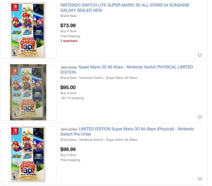 Super Mario 3D All-Stars doesn't launch until next week, but scalpers are already eyeing it as something they can make a pretty penny off of. Ebay is filled with listings from people who know they'll have a copy to sell. These listings are occurring at a time when Super Mario 3D All-Stars can still be pre-ordered from major retailers. These people know it will sell out, and holiday shoppers will want it for presents.