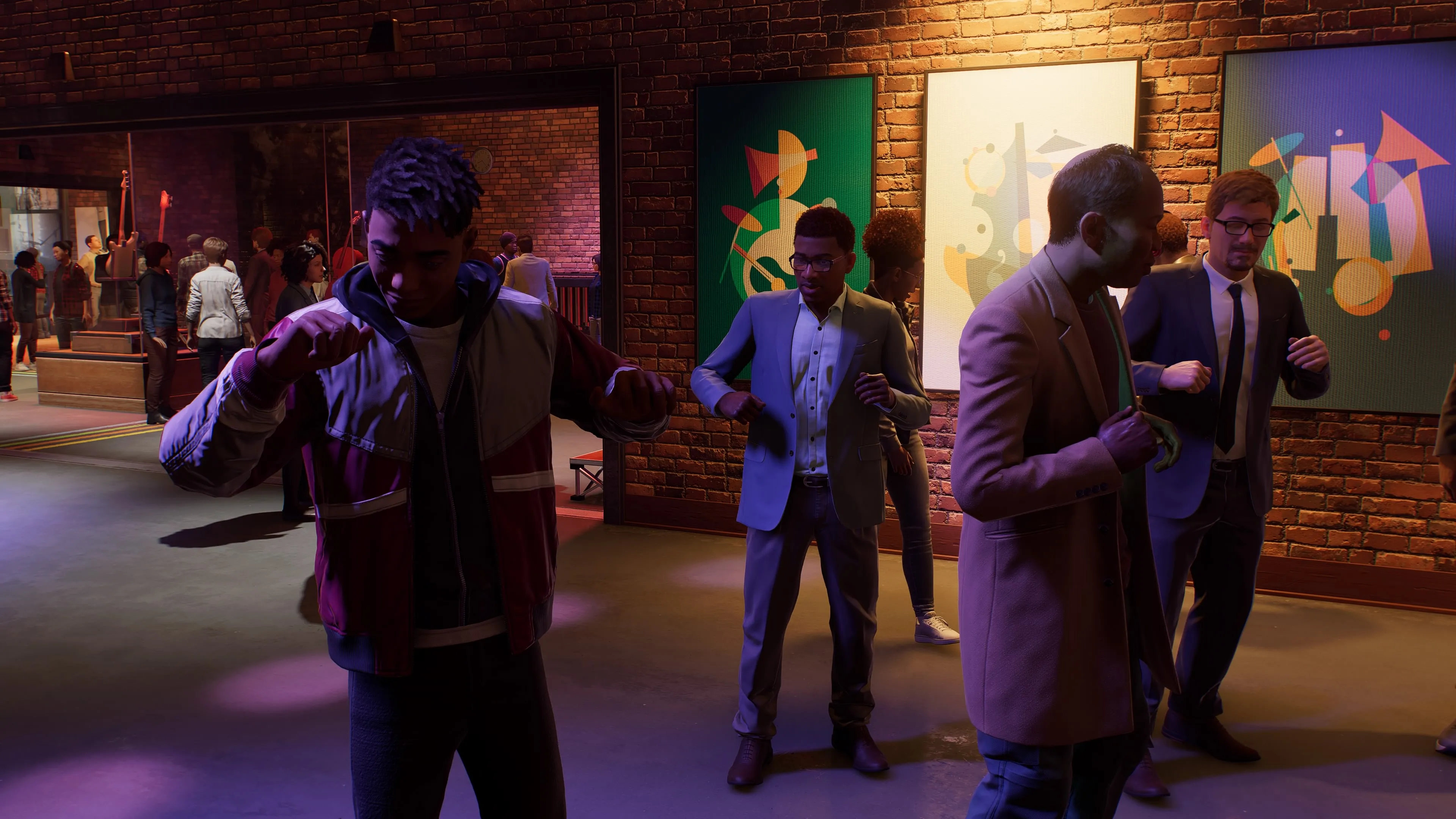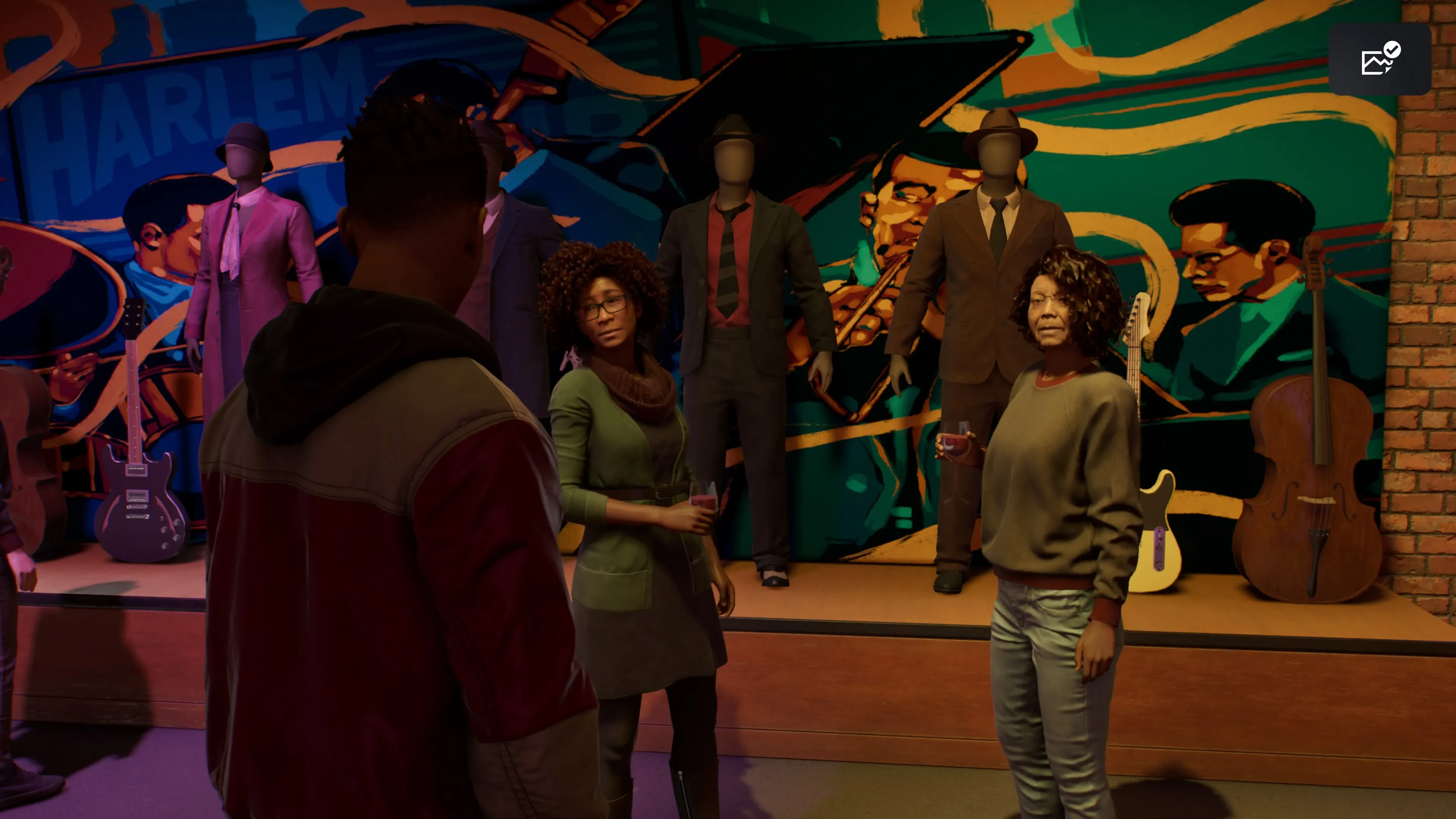 The culmination of this questline is what stuck with me in the weeks since playing. At the end of the day, the exhibit is restored, and the whole neighborhood is invited to celebrate the success. All the music history that had been hinted at is put on full display, literally – proper museum exhibits show off Charlie Parker's saxophone, Clyde Stubblefield's drum set, and a whole lot more. It's a quick but proper look into some of the biggest figures of the early 1900s jazz scene, complete with instruments, tap shoes, and poetry. As Miles explores the space, he mutters some Langston Hughes to himself, soaking in the words.