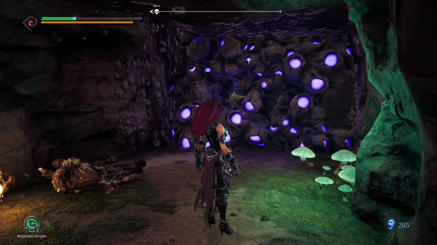 Before the demo concludes, I get a chance to explore the environment. I see platforms too far away to reach, implying a future upgrade that will let Fury access distant locations. I also find hallways blocked by glowing purple rocks, and another covered in some kind of translucent material that can probably be unlocked or destroyed with the right ability. I also see, off in the distance, a wall that looks a whole lot like the ones Death had to climb in Darksiders II. I didn’t climb any surfaces during the demo, but I bet Fury has the same upper-body strength as Death.