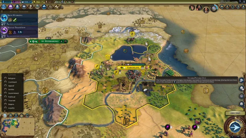 These risks and rewards are quickly apparent. Building Yaroslavl on the floodplain might lead to destruction, but floods also fertilize my tiles, increasing the farming yield once I rebuild. And flood it does. Shortly after building my city, waters rise and wipe out stretches of farmland. This sets me back several turns. Builders, who typically get three builds before expiring, have to use one build to reset a tile after a flood and a second build to reconstruct your buildings. (Tornadoes become a godsend, because they wipe a tile clean, which means you don’t have to waste your builders’ moves.)
