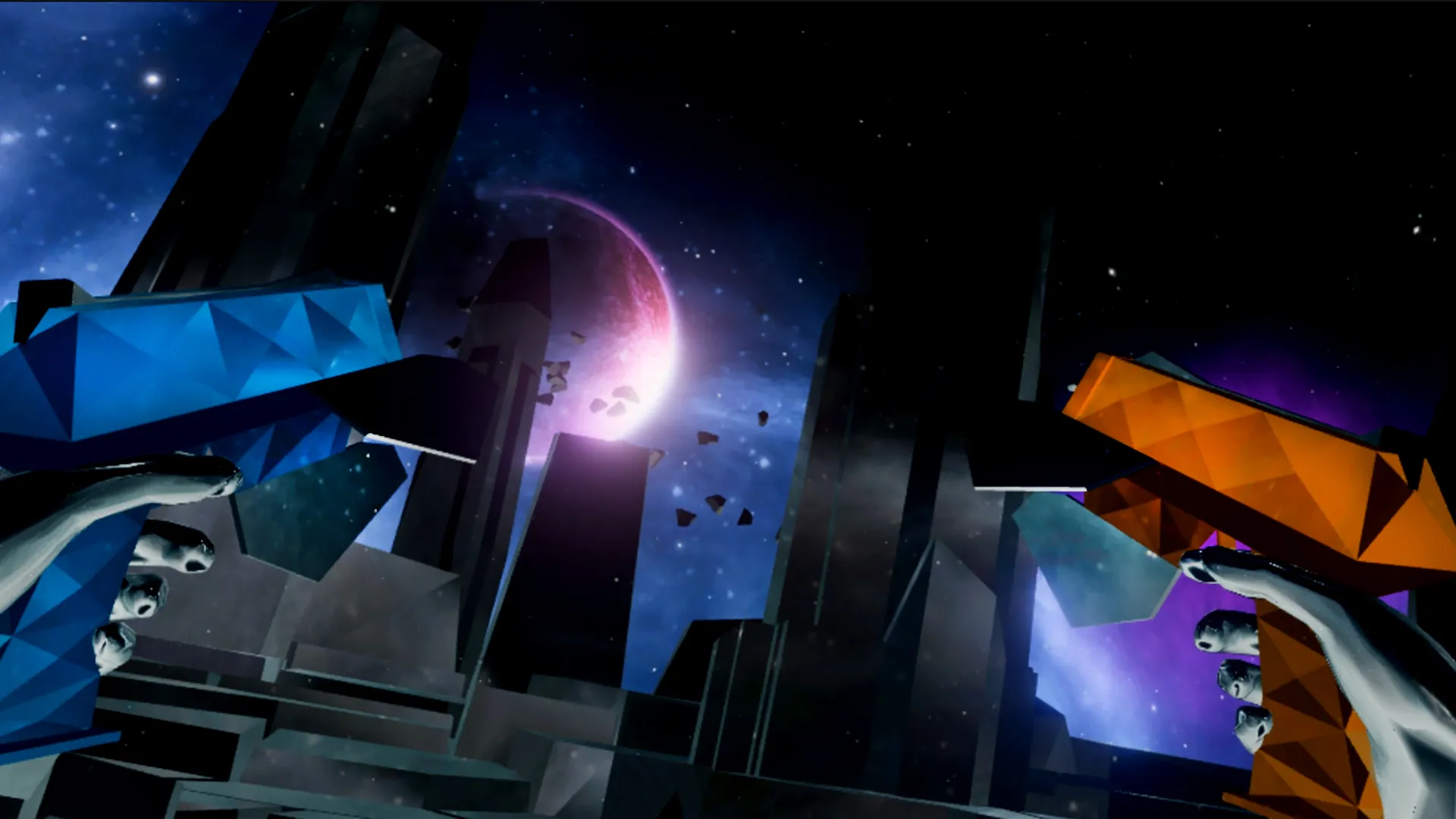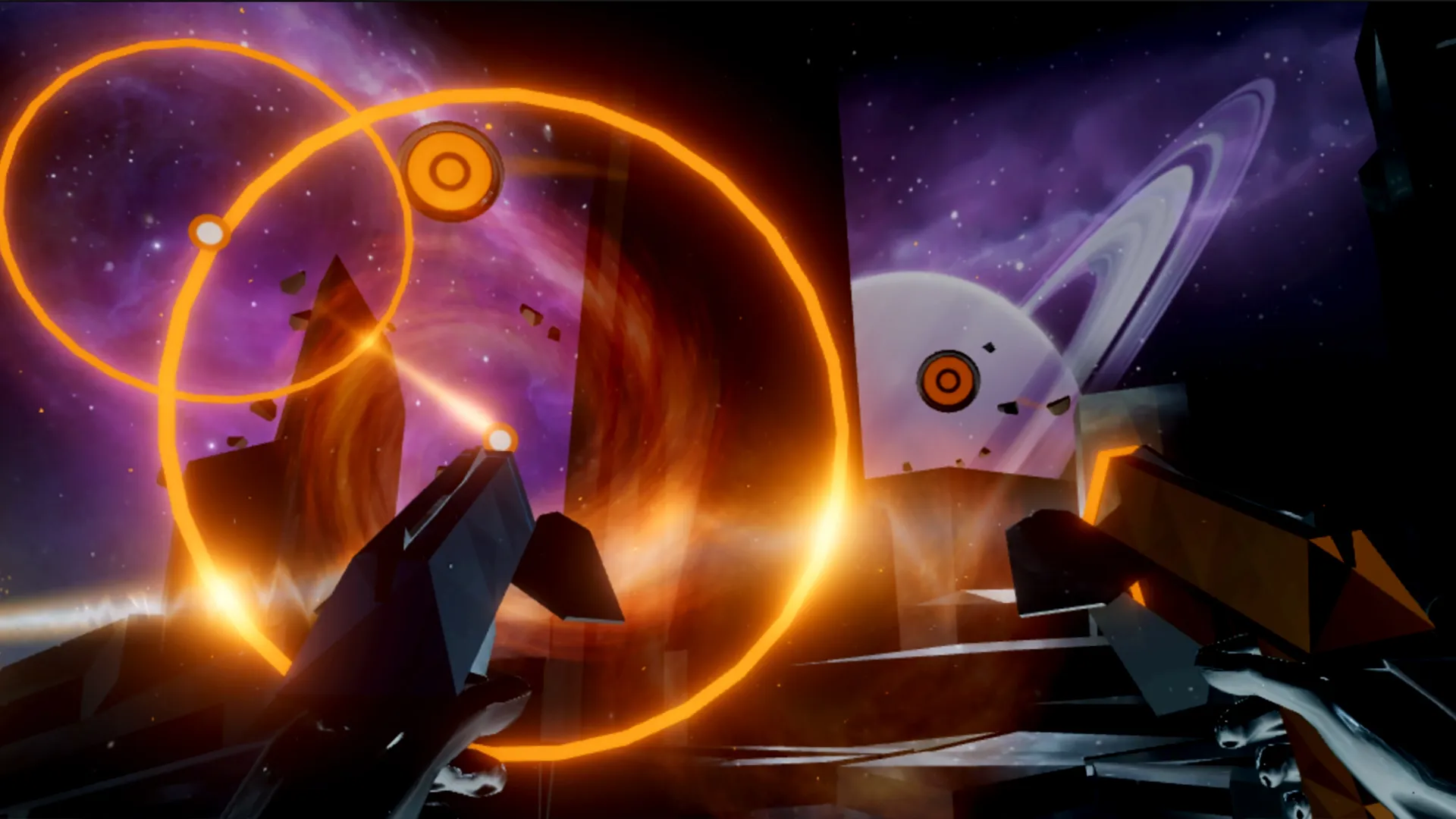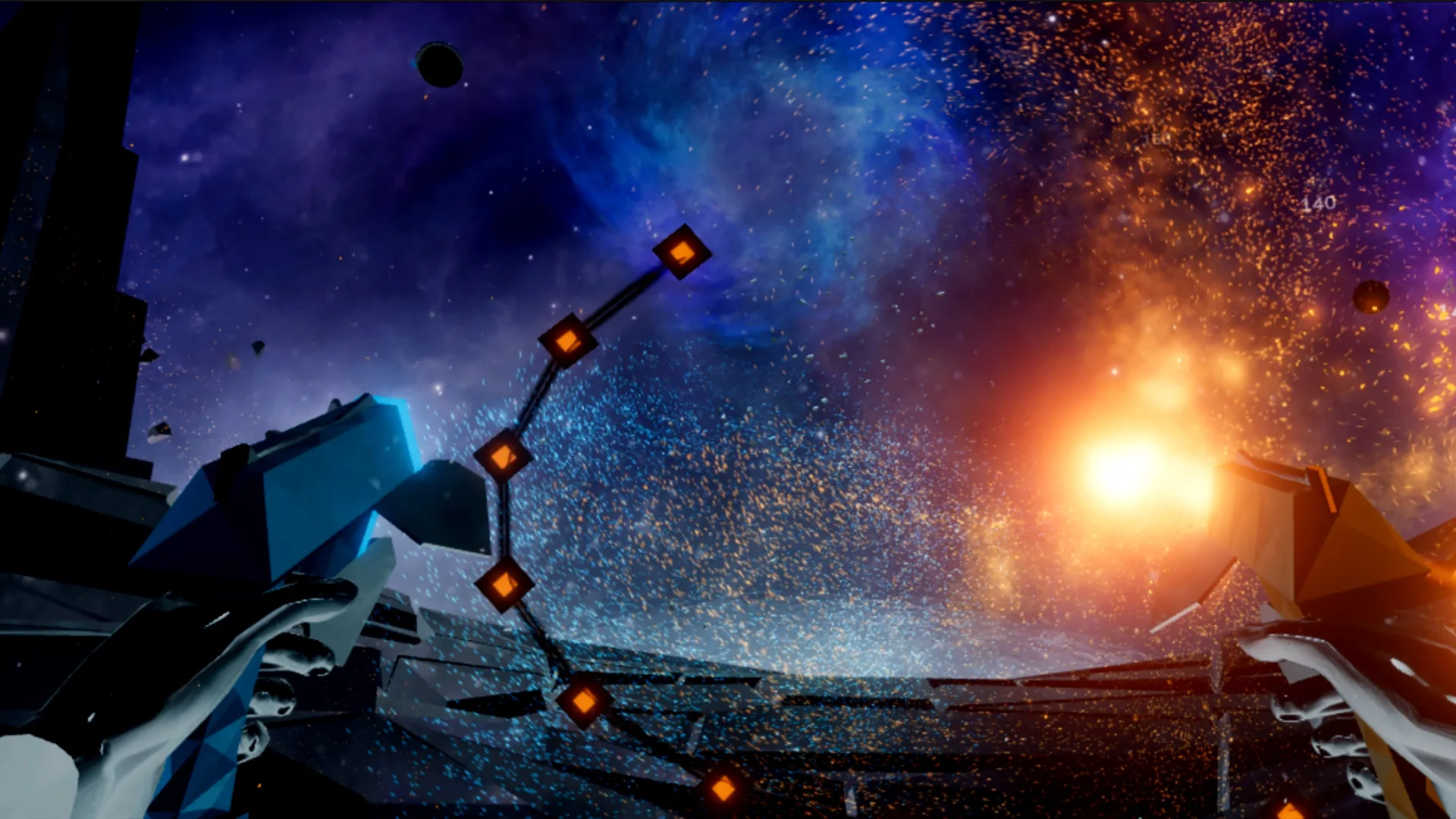 I had the chance to spend several hours shooting my way through the songs of Audica. My first impression reminded me of the sensation I had when I first picked up a Guitar Hero controller: “How has this game not already been made?” The precision shooting in VR is a fun experience in its own right, as different shots come rocketing in your direction. Blue and orange targets must be hit by the correct colored gun. Some targets demand you turn the gun on a side grip. Others require a sustained trigger pull, or holding the trigger and dragging the target shot in a wide sweeping curve, even as your other weapon is fending off a new swath of incoming projectiles. As the difficulty escalates, your field of vision fills, and you're forced to abandon singular ocular focus and rely, in part, on your peripheral vision. The beats come faster, you internalize the rhythm, and your mind drops into that pleasant trance that music game aficionados chase with such passion.