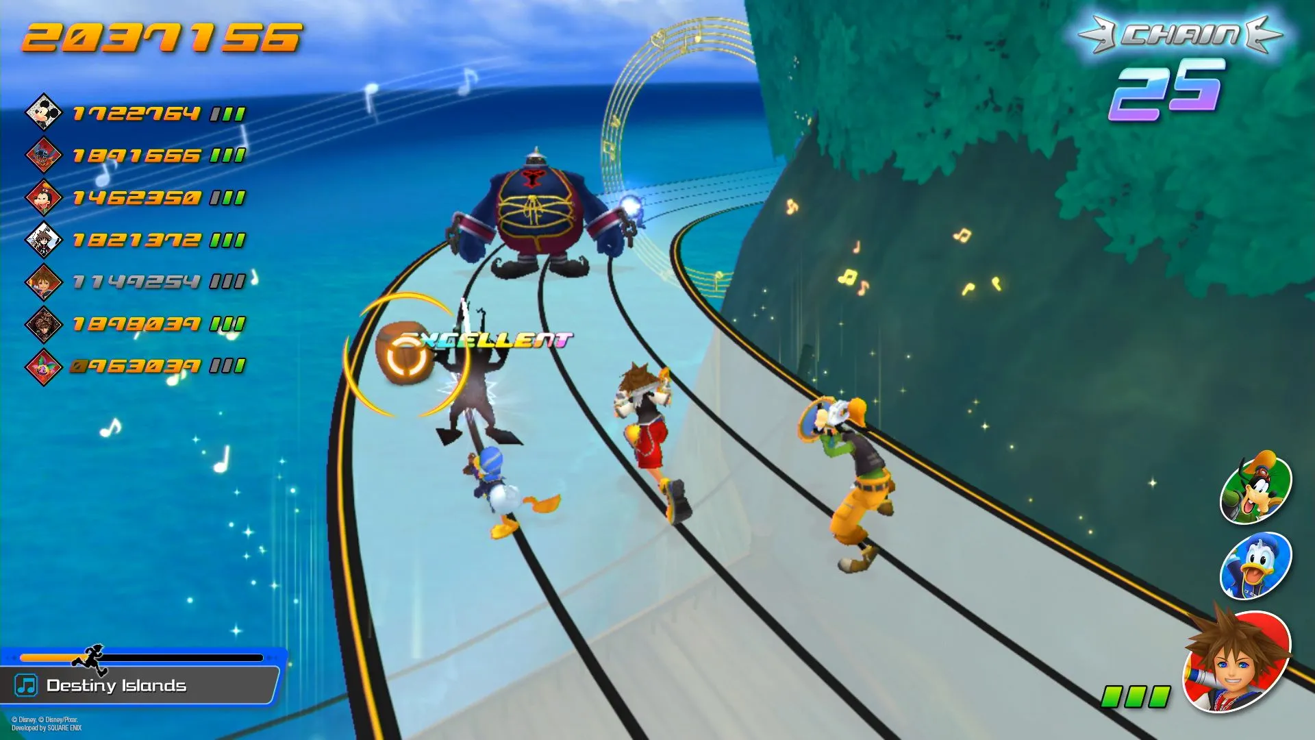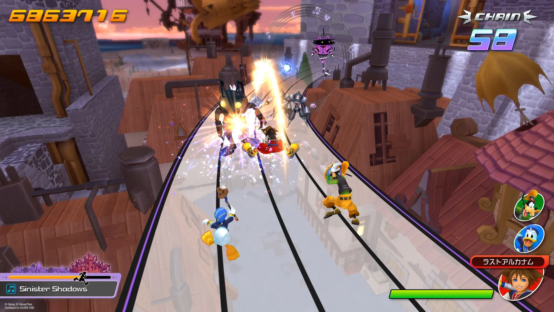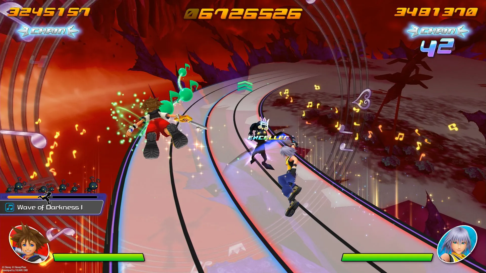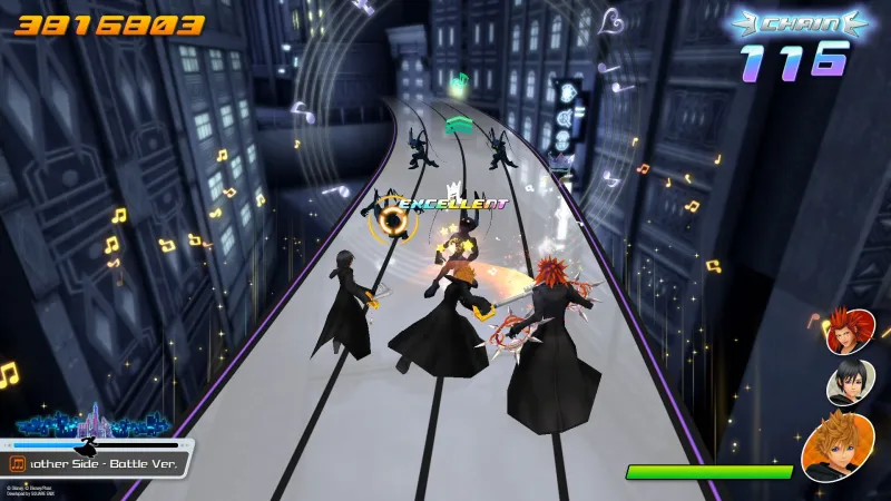 With the narrative, it’s what we call the “Dark Seeker Saga,” which has been throughout all the Kingdom Hearts titles up to Kingdom Hearts III. We traverse through all of the different key elements through that saga in order. That's the general flow. And then with the tempo and the mood of each of the stages, we have some boss battles prepared as well. Those do tend to be a little bit more on the difficult side. So there's a good variation of difficulty levels as you play through. Now that being said, we understand that there may be players who might not be as comfortable with playing rhythm action games, and so we made sure to design the game so that players are able to complete their missions no matter what difficulty they choose.