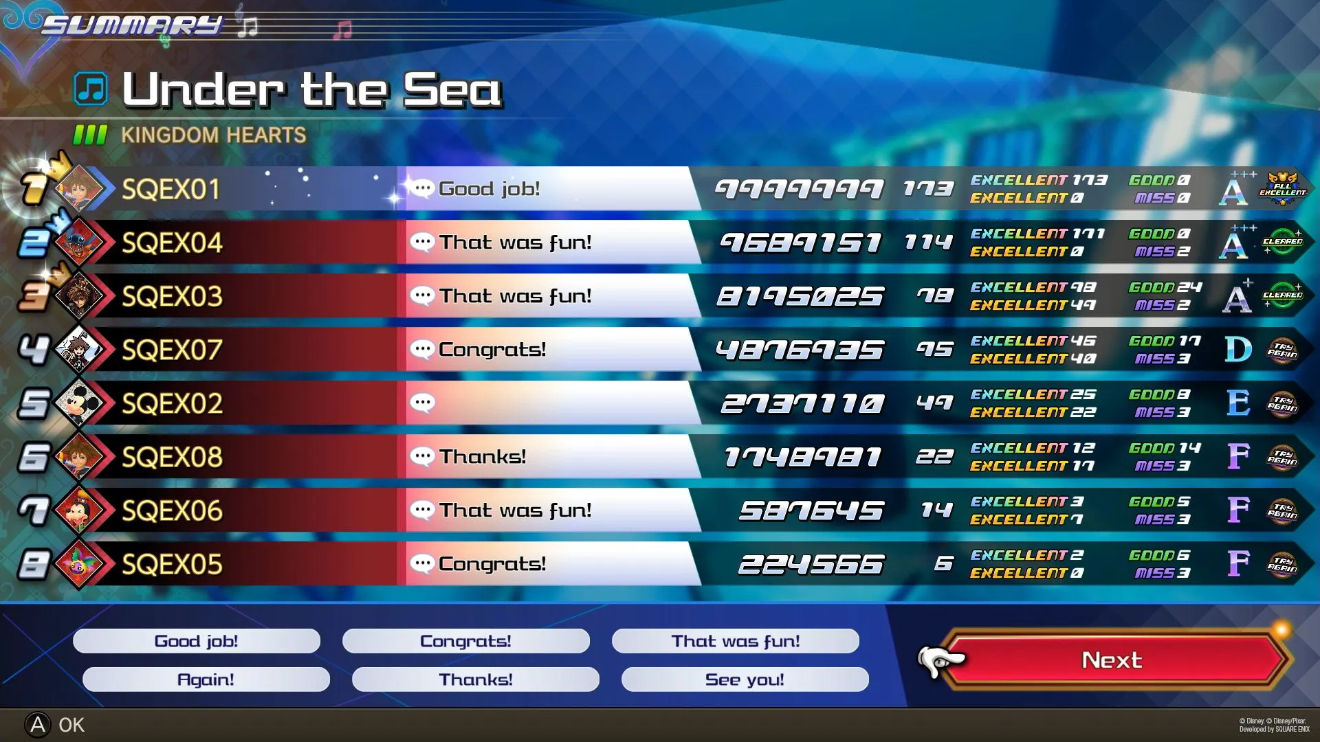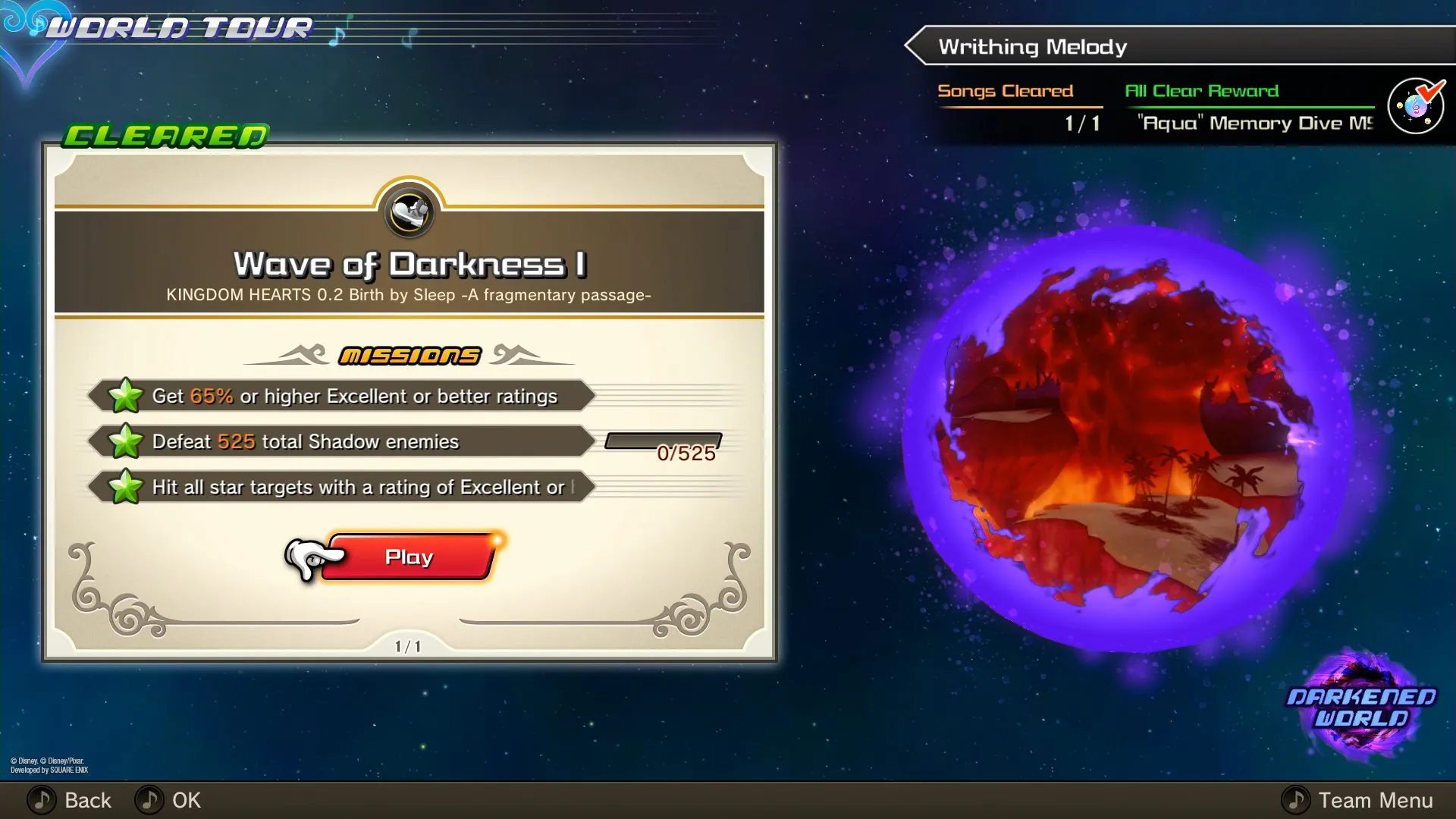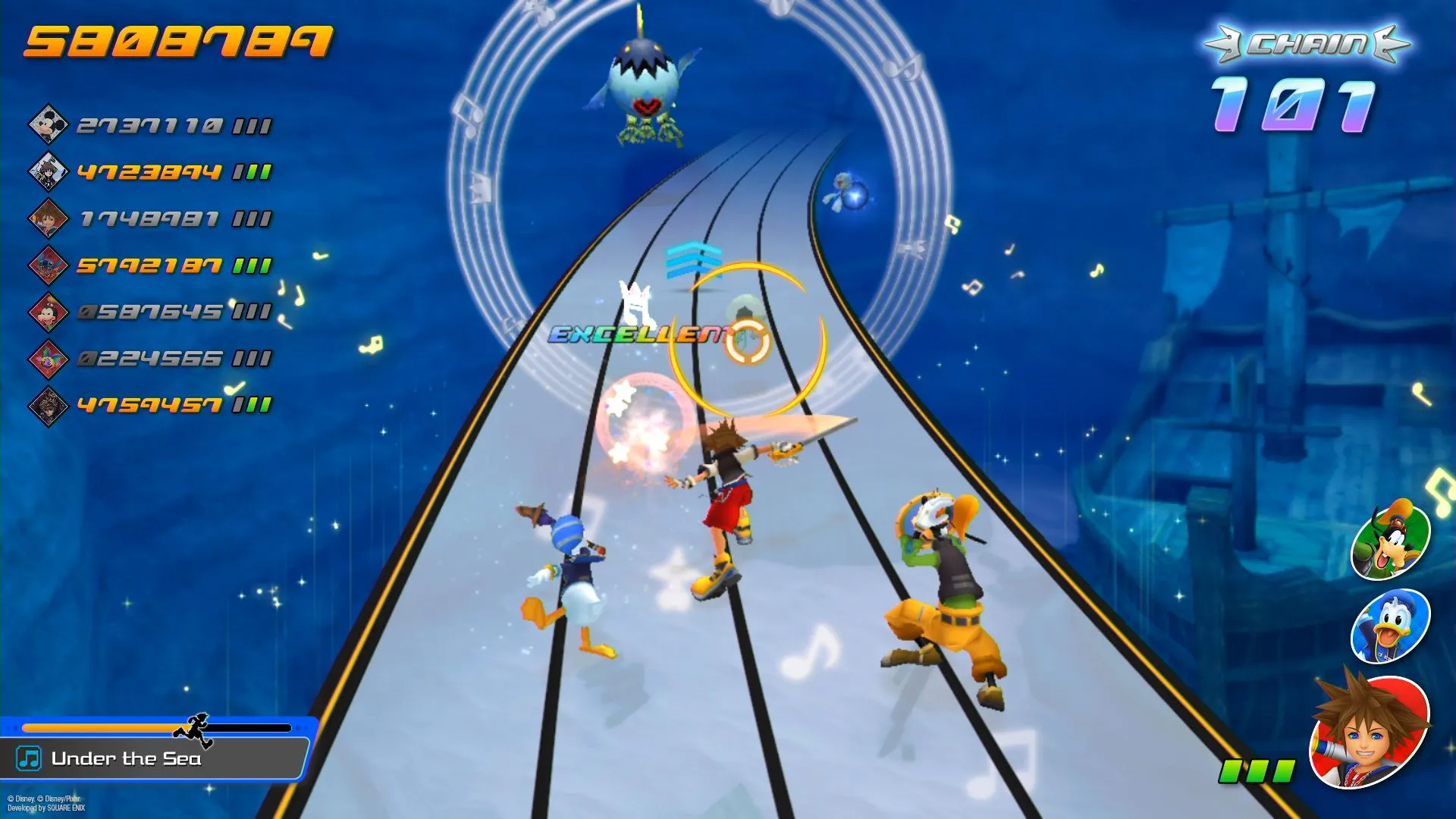 With the narrative, it’s what we call the “Dark Seeker Saga,” which has been throughout all the Kingdom Hearts titles up to Kingdom Hearts III. We traverse through all of the different key elements through that saga in order. That's the general flow. And then with the tempo and the mood of each of the stages, we have some boss battles prepared as well. Those do tend to be a little bit more on the difficult side. So there's a good variation of difficulty levels as you play through. Now that being said, we understand that there may be players who might not be as comfortable with playing rhythm action games, and so we made sure to design the game so that players are able to complete their missions no matter what difficulty they choose.