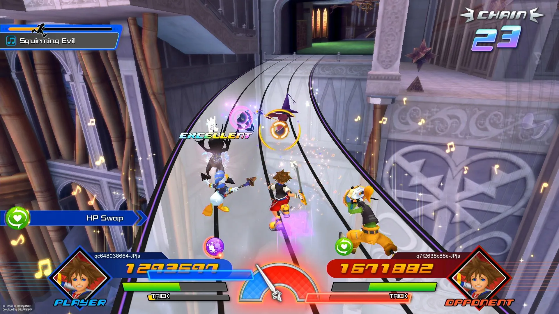 Suzui: Similarly to Theatrhythm Curtain Call, there is a versus match, but we expanded on that where you have one player versus one player and you compete for the higher score, and as you win, your rating will go up. With online battles, one of the mechanics is called “tricks,” where you're trying to not exactly sabotage, but get in the way of the other players so that they might trip. The goal is to get as many points without failing or tripping in your gameplay and competing for who gets the better scores.