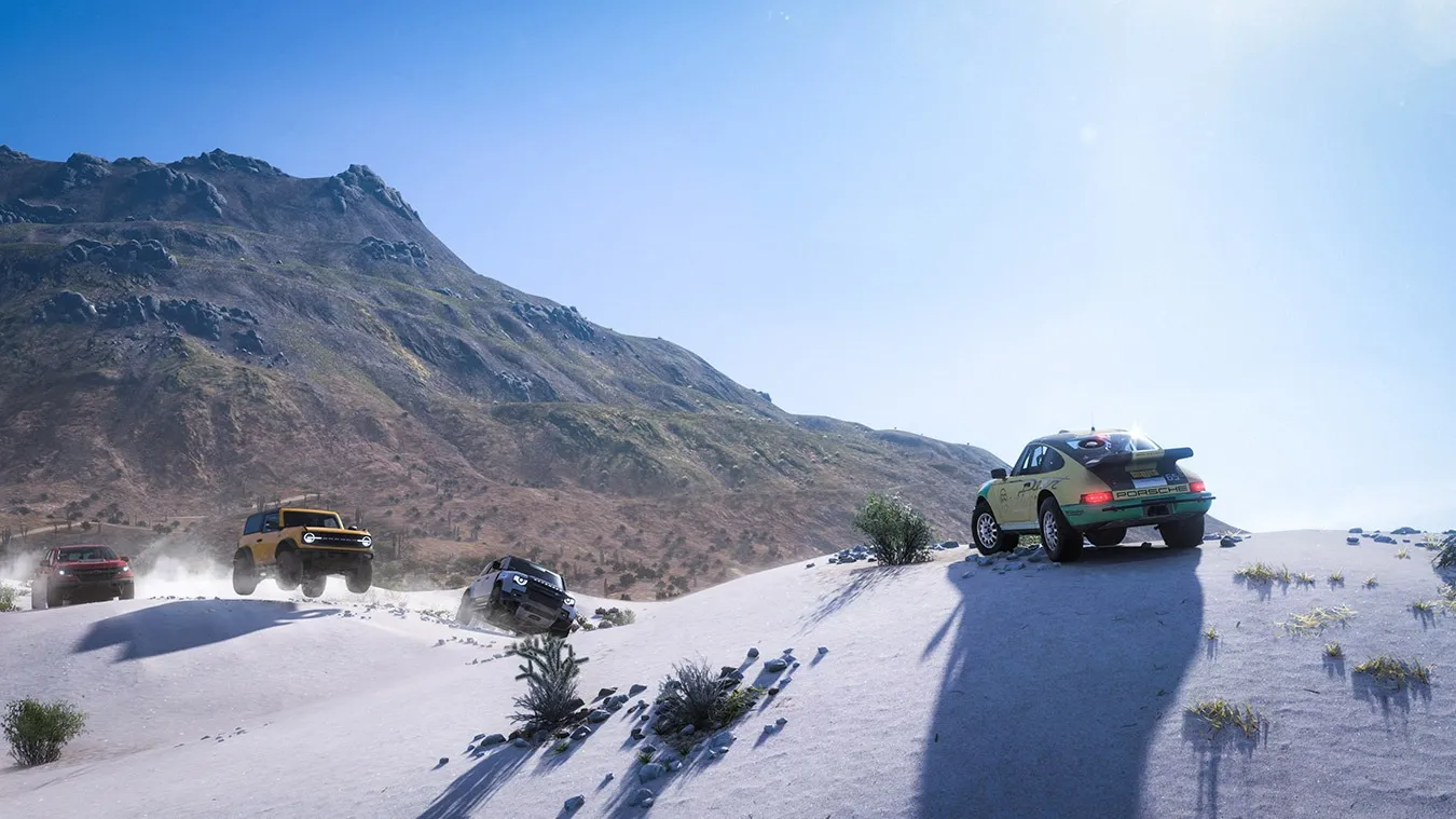What’s a Forza game without the constant promise of adrenaline-pumping spectacle? Is it any surprise that the opening seconds of Horizon 5 showcase a 2021 Ford Bronco Badlands (my dream car, by the way!) literally skydiving then parachuting onto the bumpy slopes of an active volcano? While the offroad SUV deftly maneuvers past eroding rock formations and sharp gravel, you can spot a sea of storm clouds enveloping the landscape in every direction; the Gran Caldera is the highest navigable spot in the entirety of Playground Games’ open-world racing franchise, after all. The Bronco begins its dangerous descent towards the Baja Desert, fissures brimming with inlets of steaming lava and raindrops lightly pattering against the vehicle’s broad windshield. Don’t be fooled by the heat. Creative director Mike Brown asserts that this is Mexico’s winter season, and, on cue, the molten earth gives way to thick layers of snow and sleet.