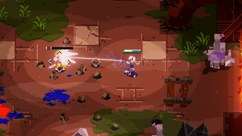 Complimenting the combat is Alma’s smooth, snappy movement. The way she runs, jumps, and climbs up structures feels great, and it doesn’t take long before you’re gleefully maneuvering around areas while slashing enemies to scrap. Unsighted knows how good it plays by challenging players with a fair amount of platforming challenges that, again, is unexpected in a game with this perspective, but it works. It also makes exploring Unsighted’s giant world a treat. The game is basically a top-down Metroidvania, and your main goal is to collect five scattered meteor shards, each guarded by a big bad. You can pursue shards in any order with certain obstacles blocked until you either purchase or locate a weapon to clear it. Along the way, you’ll find side objectives, lore bits, and other secrets worth going out of your way to uncover – provided you think it’s worth the time.