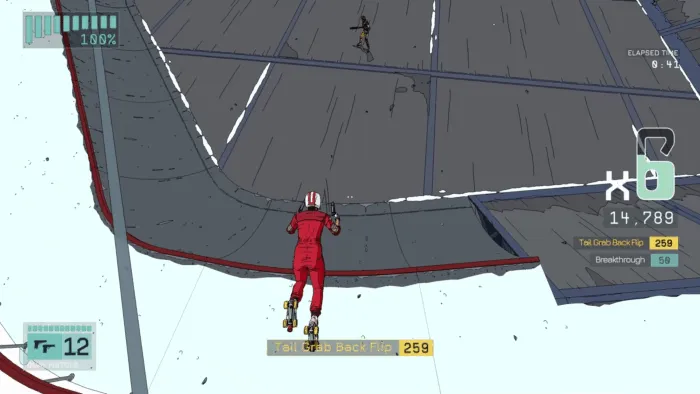 Everything in the arena wants to kill you. Snipers, rocket-wielding commanders, riot guards, and even mechs are all constantly targeting you. One of the game’s challenges is to know when to strike or evade, a hard lesson I learned after a few deaths. If you run out of ammunition, you must perform skate tricks to generate more. Low on health? Kill enemies to regenerate or quickly escape by grinding a nearby rail. If a sniper nest is out of reach, gain some air on a nearby half pipe to close the distance.
