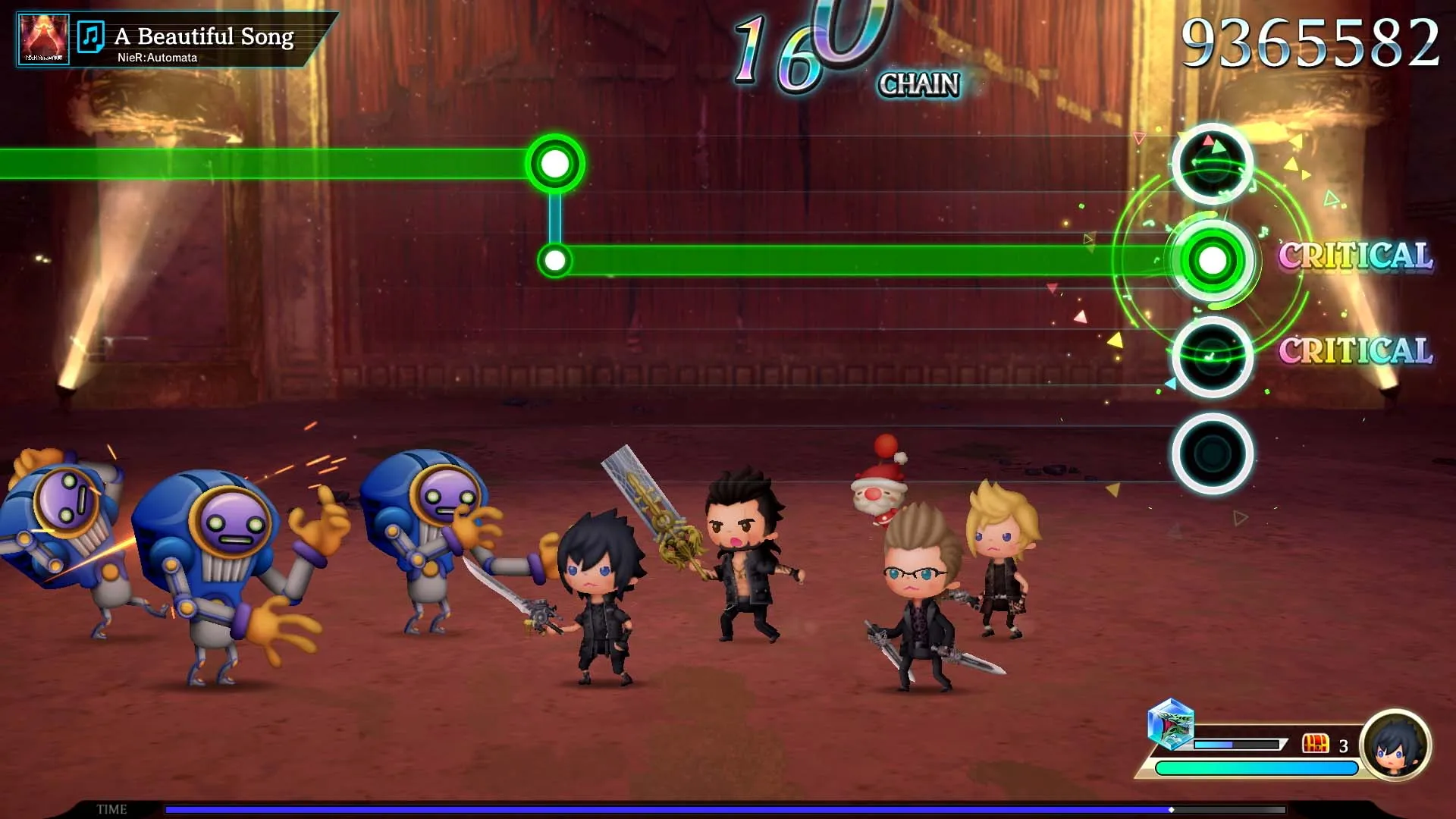 The presentation of field tracks and battle music stages are similar to the first game – your four selected characters, of which there are dozens to choose from spanning most of the included games, either waltz through a simple chibi-esque landscape or fight a chibi enemy from the selected game. It’s simple, and while I initially wanted more out of these scenes, I was soon reminded that my focus would be on the horizontal scroll 99 percent of the song and that I’d be watching the battles happen in my peripherals; which is to say the scenes that play out didn’t affect my enjoyment much in either direction. I’m excited to play through the special music video tracks in the final game, which screen iconic cinematics from Final Fantasy titles, as I think those will feature the visual flare I was missing from the standard tracks.