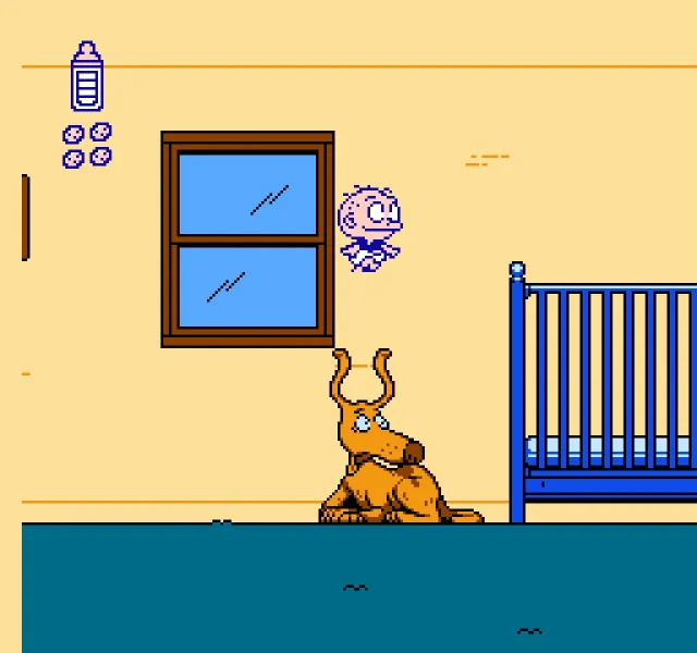 My demo, which took place on an NES, spanned one stage of the game. In Rugrats: Adventures in Gameland, you can choose between the core baby group – Tommy, Chuckie, Phil, and Lil – each with distinct jumping stats. Stages can be played in single-player or two-player co-op, with players able to revive downed babies if they take too much damage. The story follows the babies after they see a commercial for a new Reptar video game, then imagine themselves inside a game. The six stages take place in the Pickles' residence, but after an initial screen, the stage transforms into a more fantastical setting.