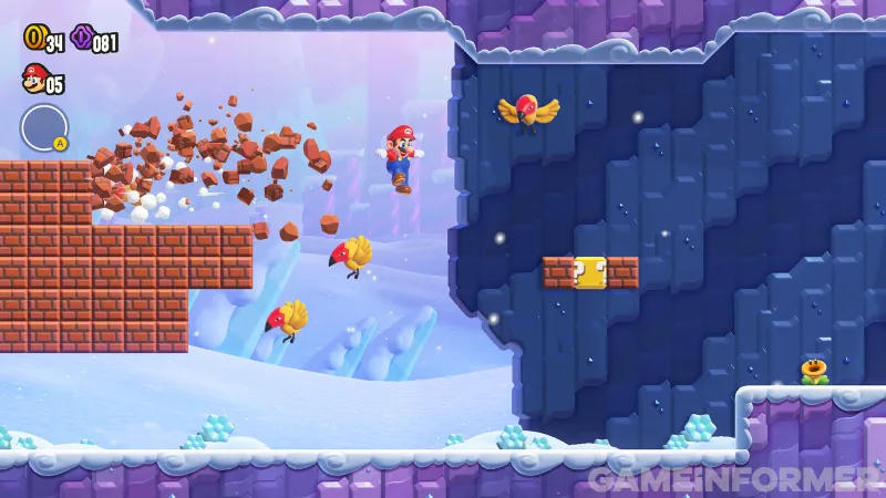 The first exclusive course I played was "Condarts Away!" The second world of Super Mario Bros. Wonder is a cloud and snow biome called Fluff-Puff Peaks, and that is precisely where Condarts Away takes place. This two-star difficulty course plays off the snow side of the world, offering a wintry backdrop and foreground; thankfully, this level is more about snow than ice, so you typically have a sure footing. As you start the stage, Nintendo aptly demonstrates how the new enemy for which this stage is named, Condarts, operates. When these yellow birds spot you, they fly forward, leading with their bright red beaks.