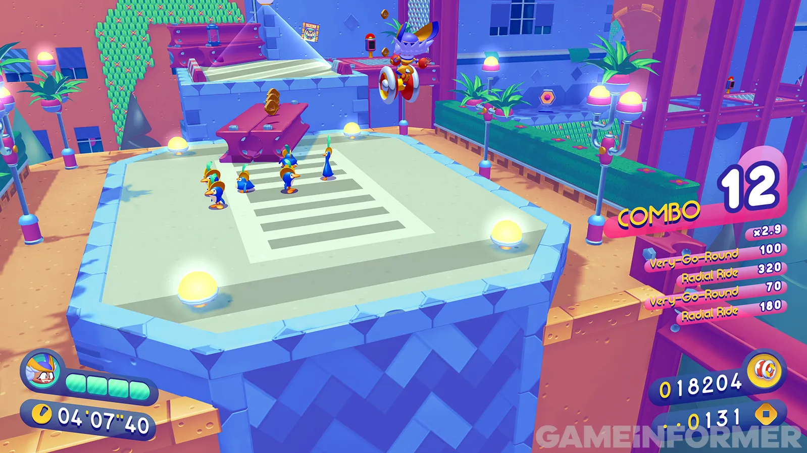 Not wanting to wade too deep into the world of independent contracts and wishing to maintain the friendship between each other strengthened in Sonic Mania’s development, the five of them formed Evening Star months after the game’s release. Studio CEO and executive producer Padilla, CTO and game director Bridges, creative director and lead engine architect Whitehead, design director Flick, and art director Fry all admit the easy follow-up was right there: A Sonic Mania-type 2D platformer. It’s what fans of Sonic Mania wanted, and to their credit, they worked with Sega on potential sequel ideas before amicably parting ways. But, unsatisfied with the easy answer, Evening Star got to work on a 3D momentum-based platformer inspired by Tony Hawk’s Pro Skater, an early 20th Century ballet, and 1995’s Jumping Flash on PlayStation.
