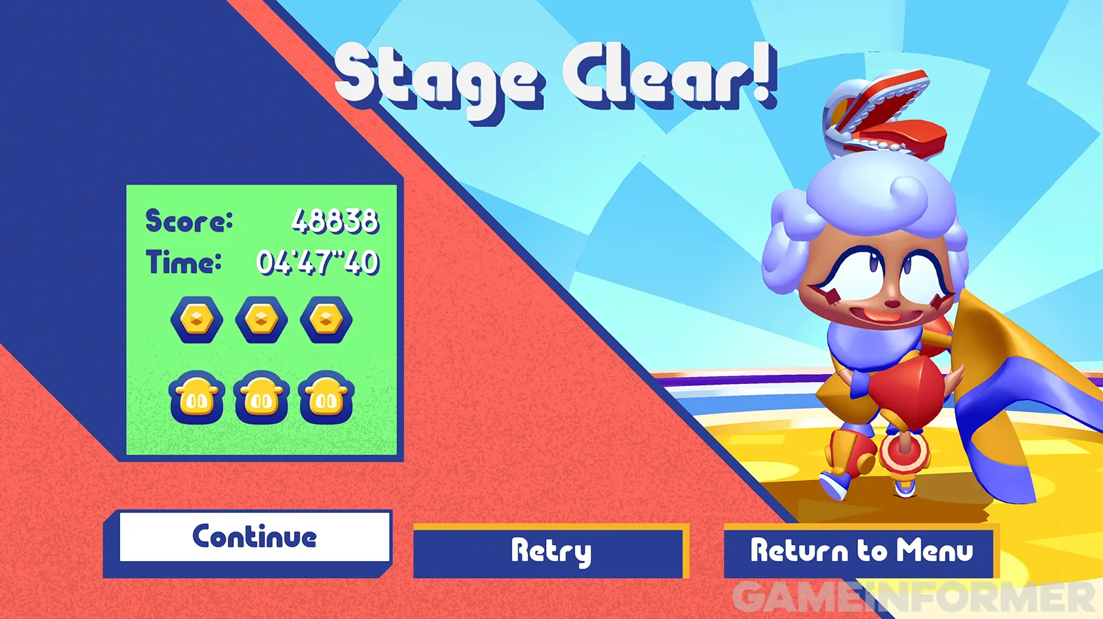If one aspect of Penny’s Big Breakaway speaks most to its early PlayStation inspiration, it’s the art direction. Inspired by the early 20th Century Triadisches Ballett and the Germanic Bauhaus art movement from the same period, combining colorful abstract ideas with primitive geometry, the world of Macaroon feels like one big performance. Your social status is defined by the performance you can give to denizens of the world. Every stage ends with a “Busker” bonus that requires quick and accurate QTE sequence completion to add additional points to your total score. Within each stage are three denizen challenges, like collecting four missing tax forms for an electric company while riding Penny’s yo-yo like a unicycle, and during the Busker bonus, the denizens you help watch you perform.