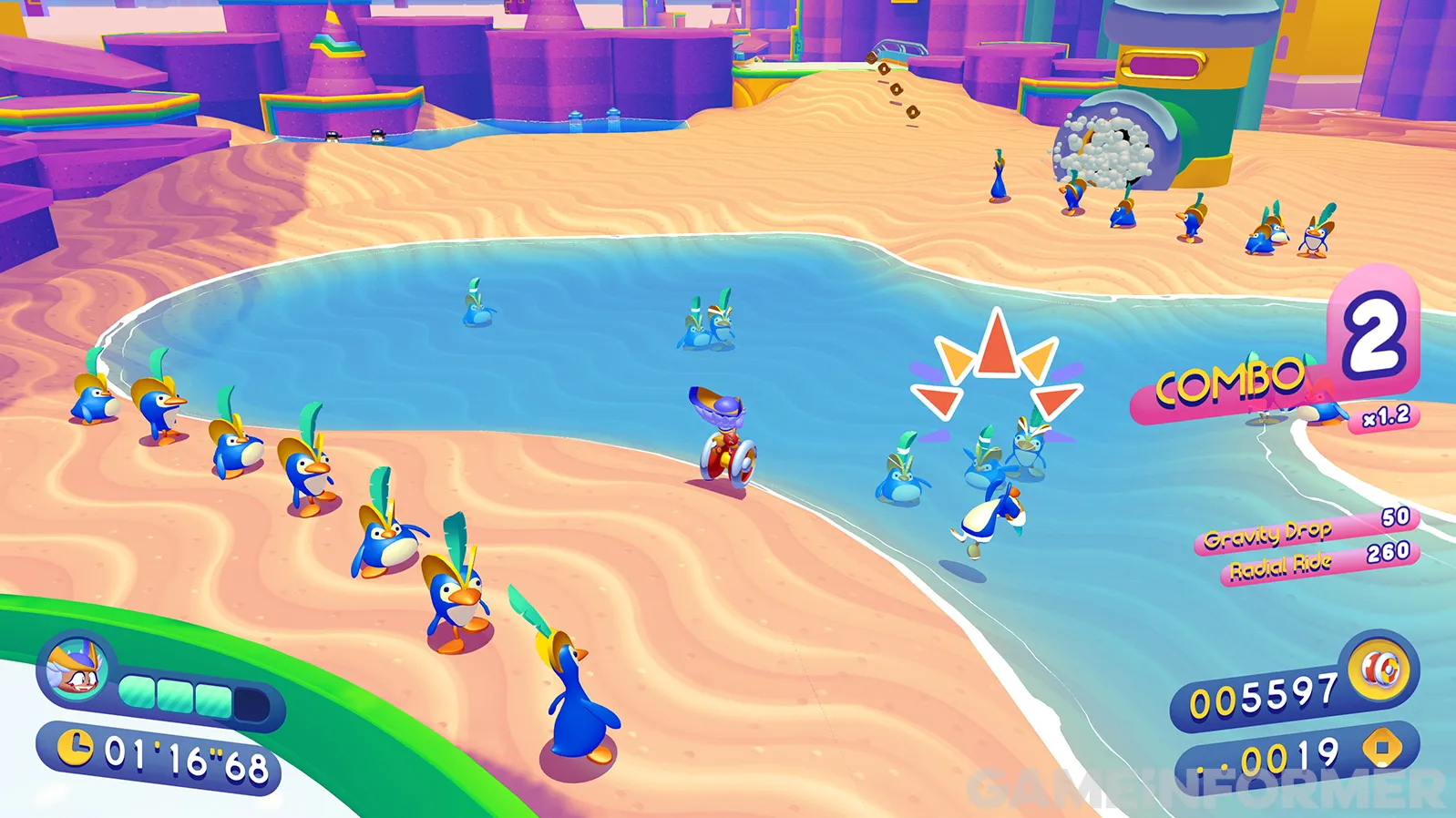 Whitehead says he’s aware Penny’s Big Breakaway is another platformer but says it’s a different flavor in a different dimension. After playing more than two hours of the game myself, experiencing the first three of 11 regions in the world of Macaroon, including three different boss stages and special Star Globe bonus levels, that much is clear. Knowing the development leads of Sonic Mania are responsible for what I play, it’s impossible to deny the momentum-based inspiration that lives in both titles. But Whitehead’s right – even beyond the obvious shift from 2D to 3D, Penny’s Big Breakaway features a different flavor. It is not just a new flavor for these developers but something unique in the long-standing platforming genre.