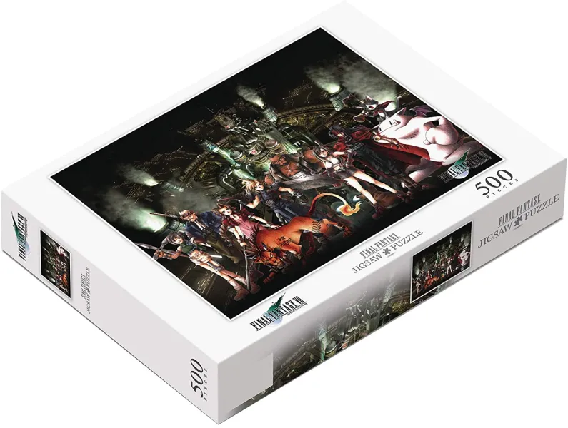 The 1,000-piece puzzle (pictured above) features Cloud posing with his Buster sword on his Hardy Daytona motorcycle. It costs $24.99, and finishes at 2 ½ feet wide. If you're looking for something more reminiscent of the original release, the 500-piece puzzle is of the cast, using the classic character illustrations by Tetsuya Nomura (pictured below). It finishes at over a square foot, and retails at $19.99.