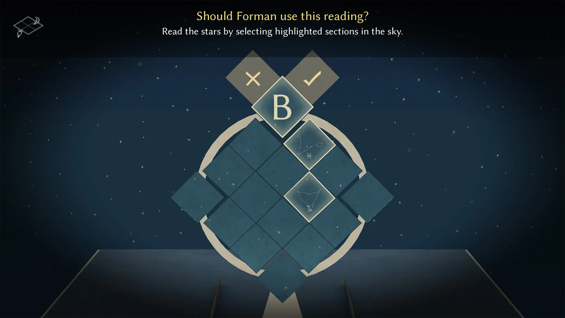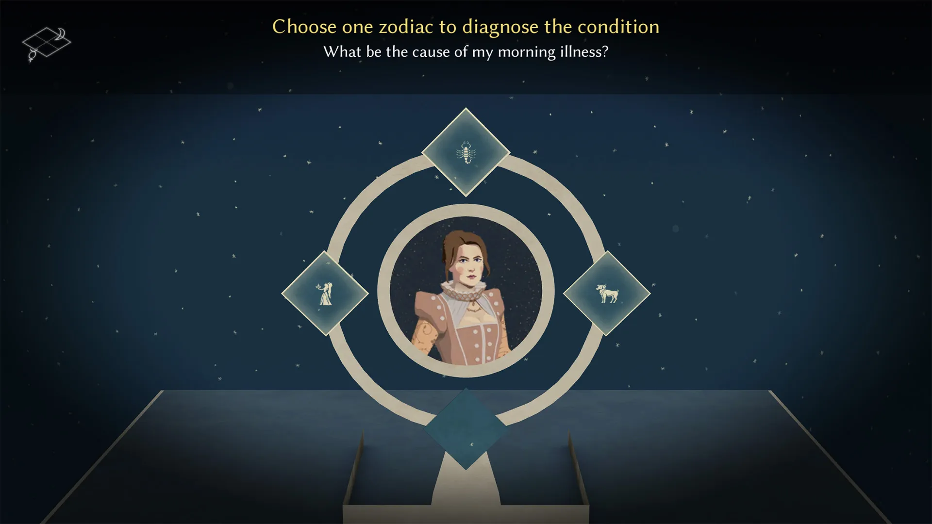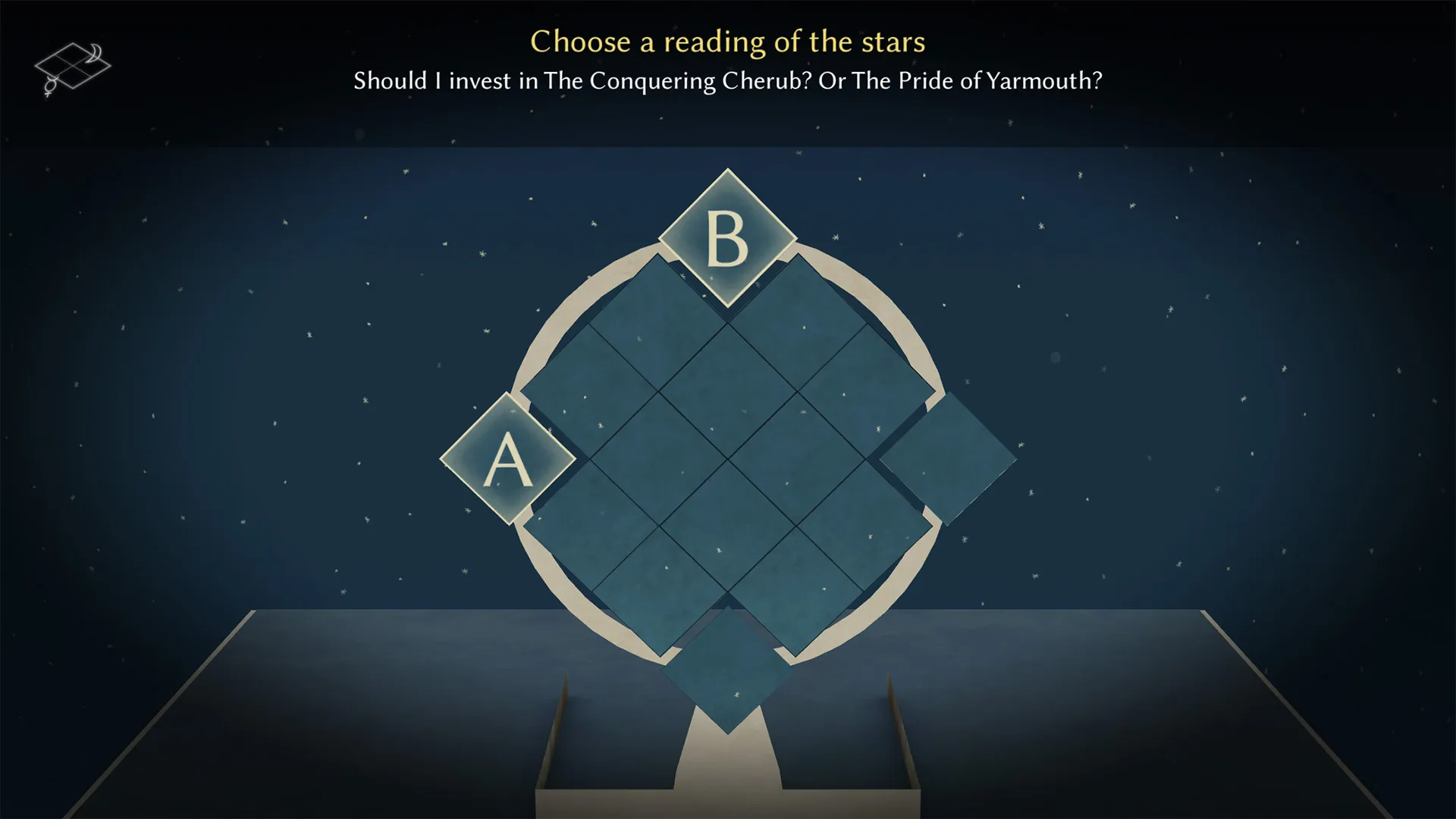 The star-gazing initially seems to have a deductive or puzzle-solving element; one of the first readings has you drawing parallels between the signs in the sky and the name of a vessel in order to recommend a ship to invest in. However, that falls by the wayside quickly, and you rarely need to decipher anything. The celestial elements influencing your choices (like “Uranus represents a change in fortune”) are technically present, but they feel extraneous since each option you’re presented with has a pretty clear interpretation summarized at the top of the screen. All you need to do is read them and decide which one to select, so the astrology becomes more of an aesthetic trapping than a mechanic you actively engage with.