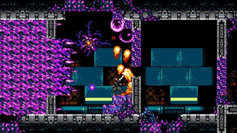 Cyber Shadow starts simple with only a jump and attack to players’ names. That limited arsenal falls flat once the nostalgia wears off (assuming you have fond memories of games of this ilk). Your repertoire eventually expands, but the game takes too long doling out abilities that make basic traversal more exciting, such as a wall-climb or sprint. Hitting a running jump and air-dashing through a foe feels great once you learn to do so, but Cyber Shadow demands players stick it out for seven of the game’s ten chapters to get there. Requiring players to endure two-thirds of a punishing game just to obtain skills that belong in every ninja’s starter kit does not feel satisfying.