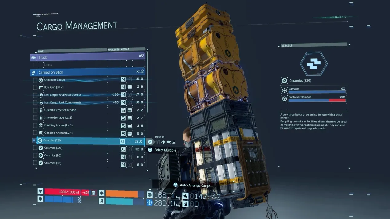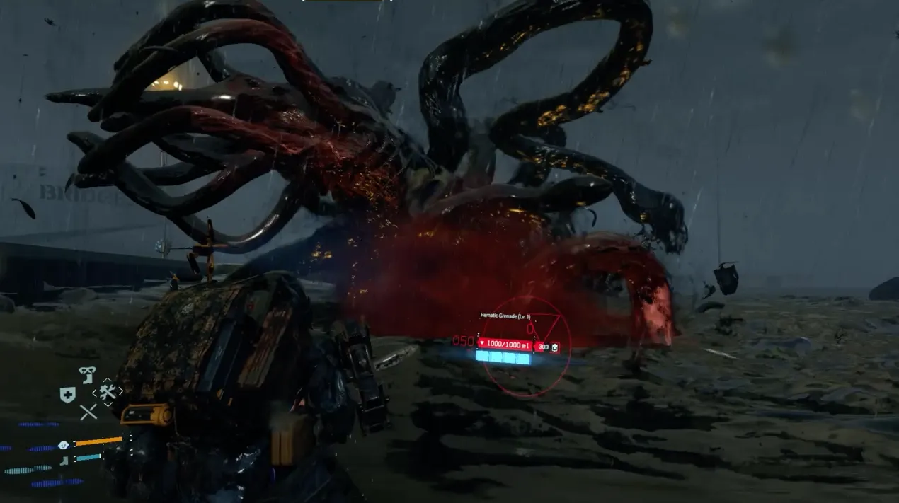 Overall, Death Stranding’s intertwining systems are well thought out. Rain and snow (called Timefall) damage everything they touch, so I like the sense of urgent survival when the weather report shows precipitation on the way. Building zip-lines and safe houses in useful areas is satisfying, especially since they augment the overall network of nodes that keep you supplied and aid your travels.