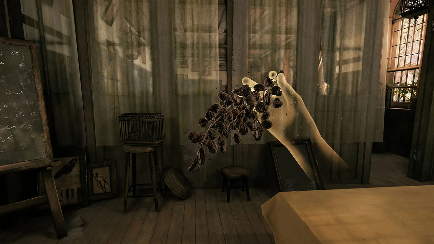 Déraciné begins by introducing you, a magical faerie, to a group of orphans. They can’t see you, but they know you’re intervening in their lives at random intervals. You experience life as moments frozen in time; the world is essentially paused when you appear, resuming only occasionally so you can listen to a snippet of dialogue or watch something small happen, like see a pair of kids try to sneak into a window on a second floor. You can also see ghostly memories of the children wandering the halls who share bits of exposition as you piece together what is going on.