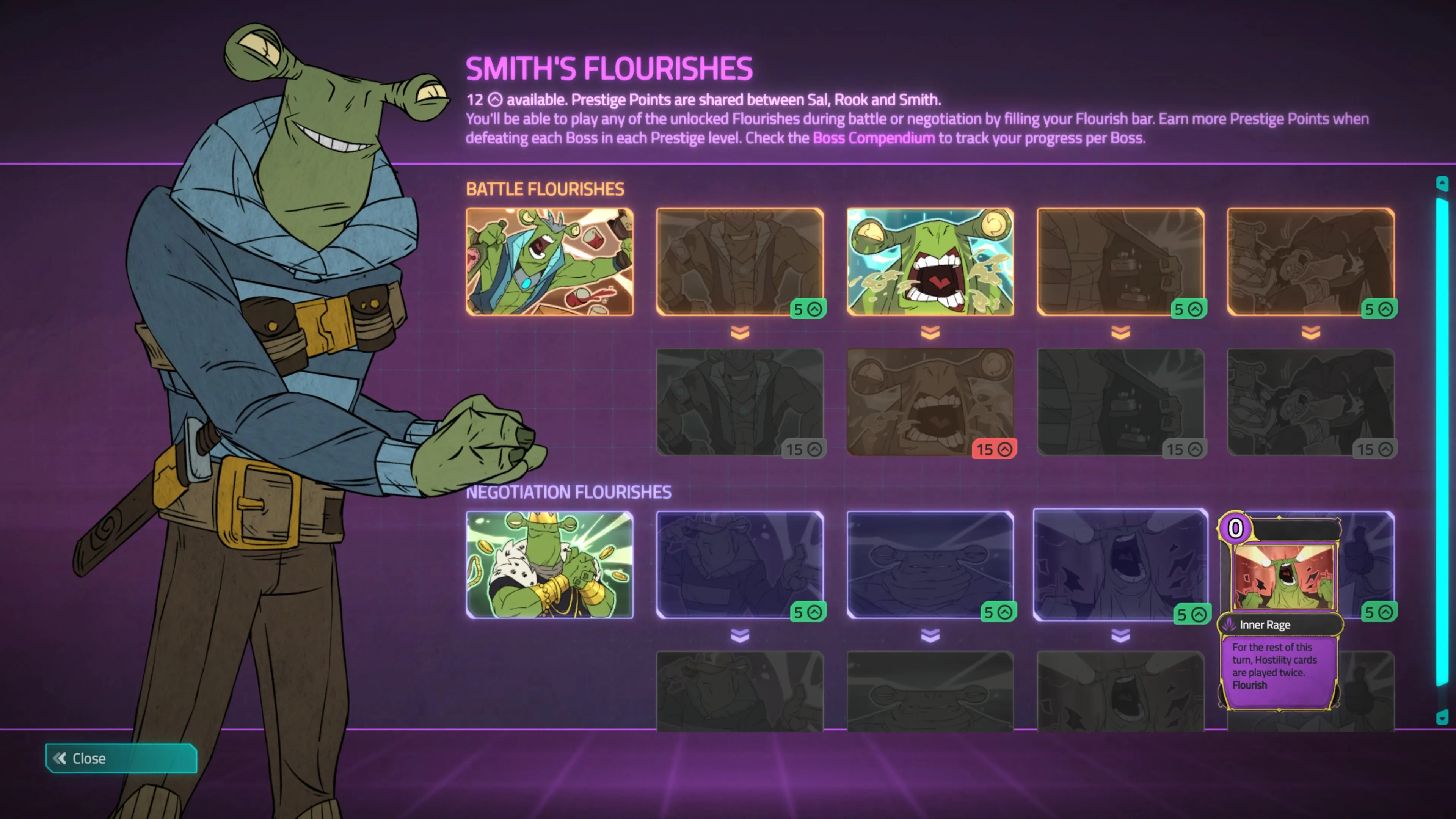 Griftlands’ three distinct campaigns are full of meaningful content, each following a unique character in different areas of the harsh continent of Havaria. Sal seeks revenge against someone who sold her into indentured labor in Murder Bay. Rook is a former military agent specializing in espionage who works both sides of the conflict in the Grout Bog – just like he works his trademark lucky coin. Smith, the black sheep of a wealthy family, aims to collect an inheritance he was never promised by bolstering his fame despite his heelish personality. All three stories feel very different, but together paint a great picture of the factions, people, and struggles that tie the world together. Sal’s narrative feels more urgent and dire than the others, while Smith’s story is breezier and lets you revel in playing a self-absorbed jerk. Learning their differing styles of combat and negotiations is a joy. The entire cast is fun to pilot and each employs tactics in-line with their personalities. For instance, Smith uses his notoriety to do the heavy lifting in negotiations while his combat style is a mix of heavy drinking and self-harming pro wrestling moves. Discovering ways to exploit Rook’s reliance on coin flipping manipulation and creating devastating negotiation combos was an absolute highlight of my time in the Griftlands.