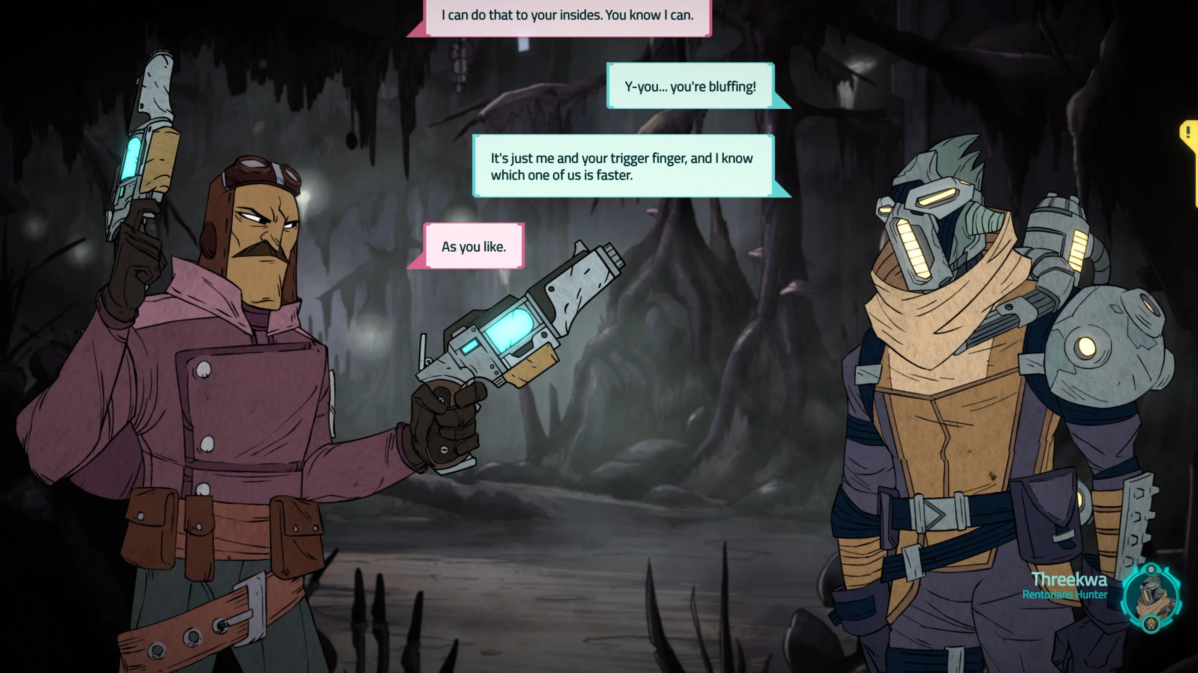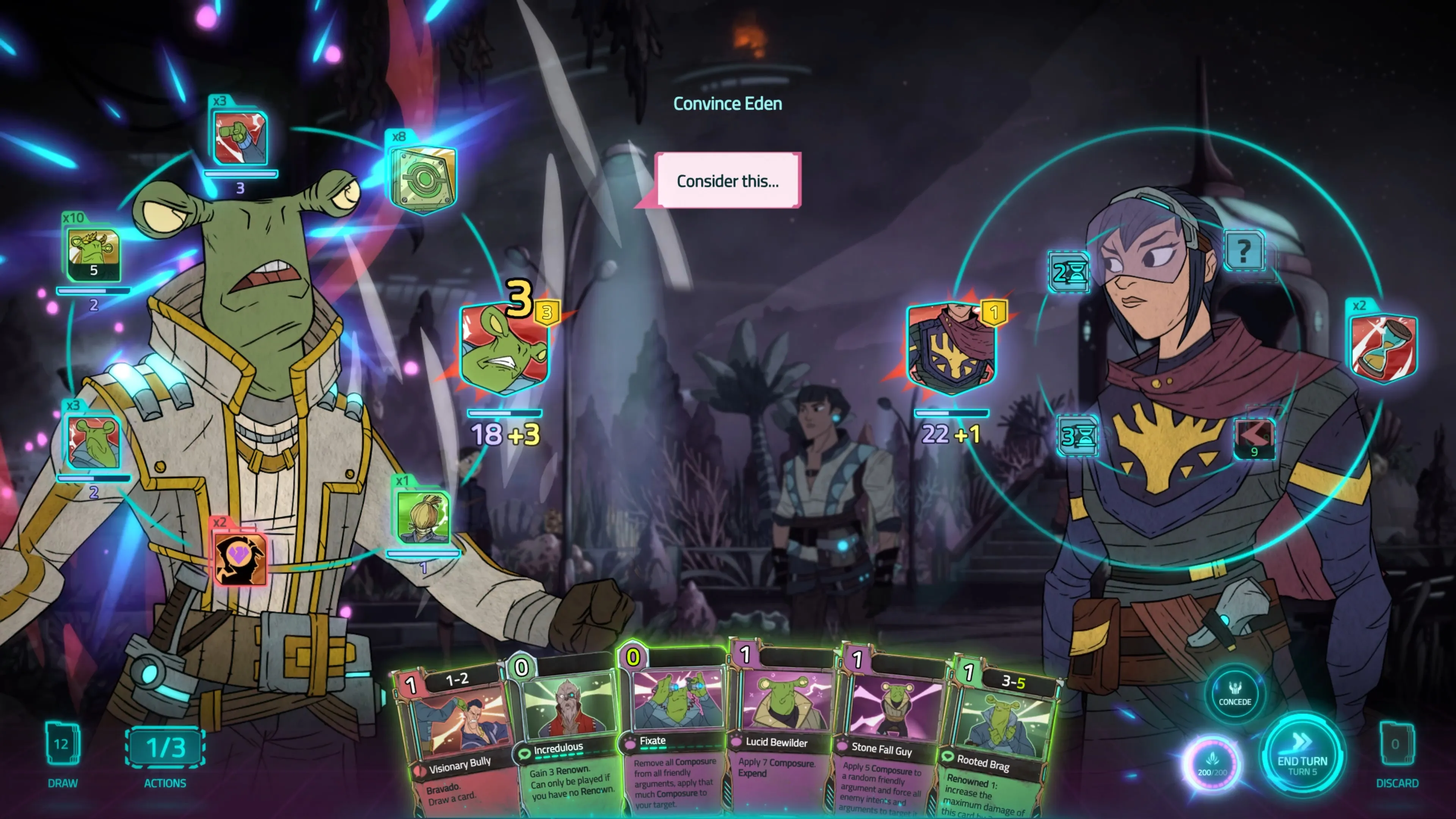 The bulk of Griftlands’ action revolves around card slinging during heated negotiations and battles. However, the combat and negotiation systems both have bespoke decks and mechanics. Battles are straight forward physical fights where you use attack, defense, and augmentation cards to defeat the opposing force. These augmentation cards do everything from apply damage over time to increase the power of other attacks and they do a great job adding strategic depth to the action. Sentient enemies and allies have panic points and surrender once their health drops below a certain threshold. This clever system gives you a powerful and intriguing choice to spare or execute your foes, though accidents happen, and people can die regardless of your intentions. Killing an enemy rewards you with cards to add to your deck, but their death makes the public aware of your pension for violence and can turn a victim’s friend into an enemy. I enjoyed maintaining the delicate balance of keeping foes alive while dispatching of their cohorts to keep my character’s standing in the world as pristine as possible. Adding this combat puzzle to encounters wonderfully extends agency into a system easily boiled down to kill or be killed and helped add additional stakes to each encounter.