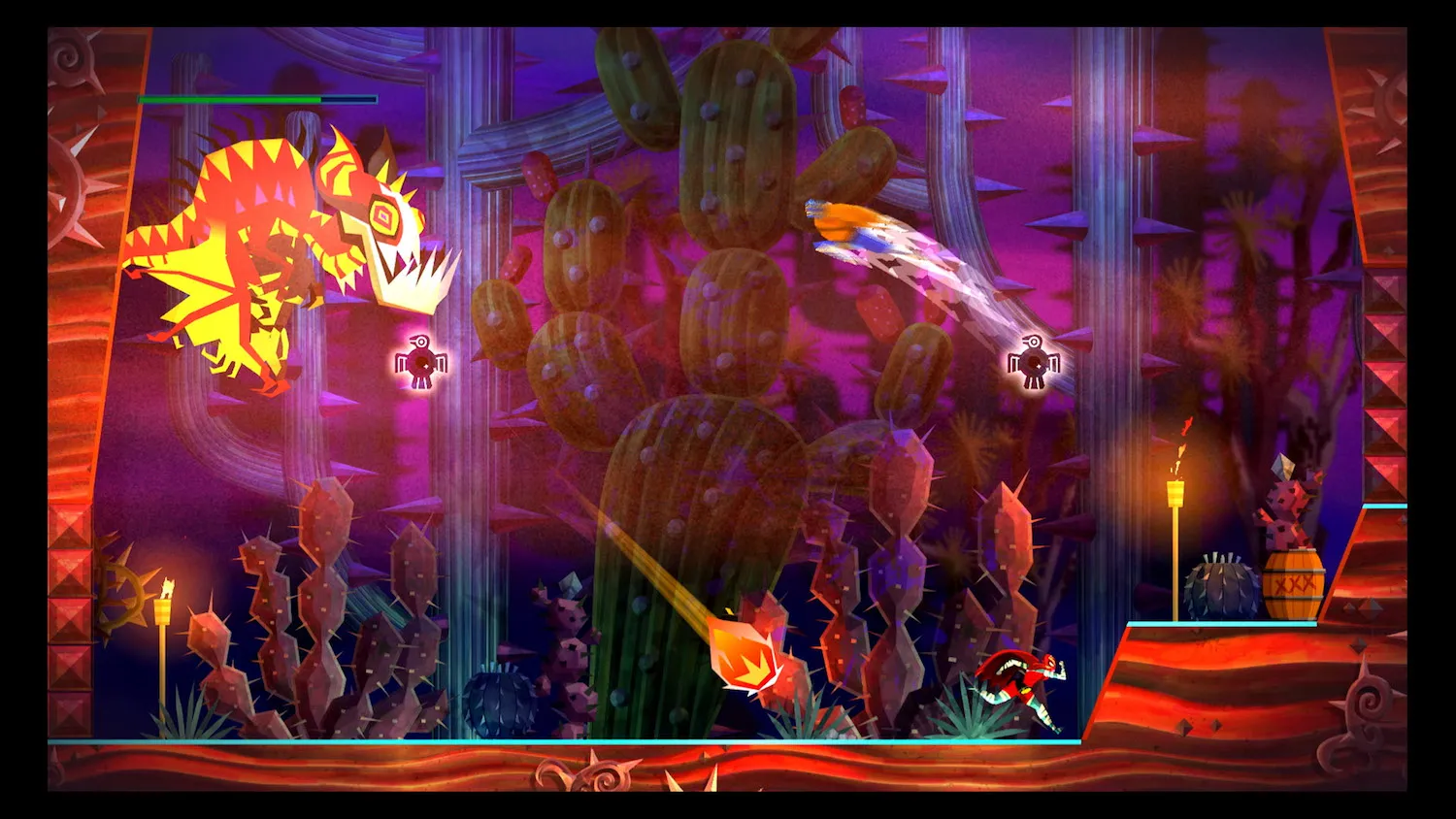 Both the combat and platforming boast incredibly precise controls. Building up big combos against enemies is fun and gets easier as you level up your special attacks, which happen to double as navigation tools. The uppercut functions as a double jump, and plays into a clever mechanic where breaking through the shields of certain enemies requires specific attacks. A glowing blue enemy requires Juan’s sideways thrust ability which also breaks blue doors, and gives the extra distance often needed to hit a just out-of-reach ledge. This shield-breaking system means you are constantly using Juan’s entire arsenal of moves, preventing you from relying on a favorite attack and approaching fights a little bit like a puzzle. It made every battle consistently exciting.