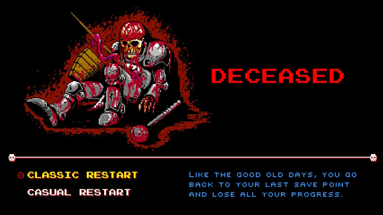 In the first 10 minutes of Infernax, I faced a choice to kill or spare someone who asked to die. I chose to kill them, and without a moment’s hesitation, my character’s mace crushed through their skull. Their face was mangled, with eyes popping out the sides, as the mace destroyed everything between their nose and the cowlick on the back of their head. It is a brutal introduction to the “kill or spare” choice system that presents itself a handful of times throughout Infernax, and it was only a taste of the carnage that’d soon color my crusader’s journey to defeat evil once and for all.