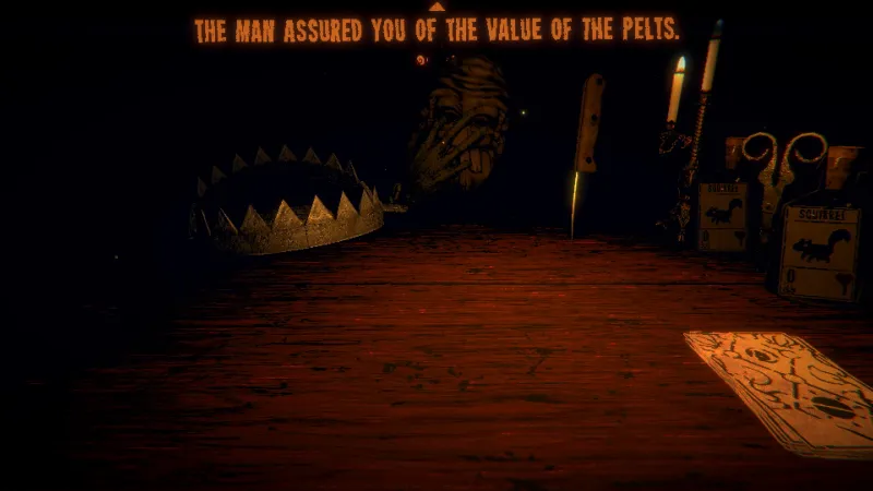 You wake up in a dark cabin, chained to a worn table. A mysterious man sits on the other side of the room. You can't see the details of his face through the darkness, but his crazed eyes pierce the shadows. Something under your belly lurches as he invites you to play a card game. The rules seem simple; you summon creatures to attack your opponent's army of foes, and you easily win the first few hands. Still, you can't shake the anxiety of what might happen if – no – when you lose. You play on, the eyes on the other side of the table slowly burning a hole in your stomach.