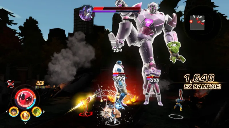 Most of the characters are handled well, giving you a range of powers that fit their personas. The Hulk is the rampaging mess you would expect, Deadpool is a powerful goofball, and Nightcrawler is constantly “bamfing” all over the place. Some characters are a little phoned in, however. Doctor Strange basically has the same flame attack as Ghost Rider. Most of the hero abilities are brought to life with an array of particle effects and graphics – often too many. Just keeping track of where the characters are onscreen can be difficult, especially when the camera switches to distant perspectives (which makes handheld play a little rough at times). The camera can be a serious pain.