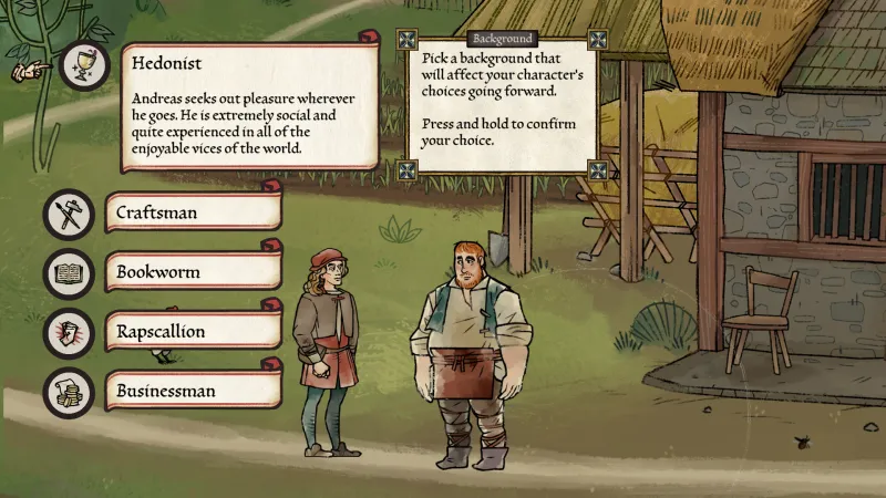 Andreas can be customized with different backgrounds and personality traits to unlock different dialogue options. My Andreas was a theological scholar with a history of hedonism, but another might have studied law and spent his time enjoying nature. The dialogue options these different backgrounds unlock aren’t usually anything substantial, but it’s nice to have a sense of control over your conversations since they make up the vast majority of the game.