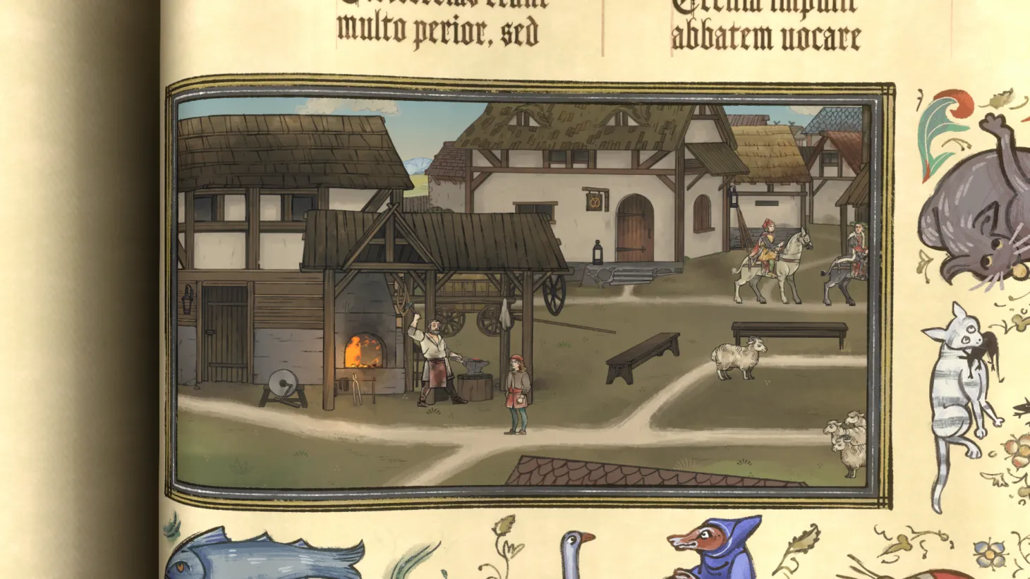 This book-like aesthetic is one of Pentiment’s most charming qualities. It starts from the first moments of a new save file, where you scrub the pages of an older book to write this new one. Characters and their surroundings are depicted as beautiful, era-specific illustrations. The menu is also a book, complete with a glossary to keep the player filled in on all the historical terms they might not be familiar with. You can press a button whenever one of these terms appears to see their definitions scrawled in the margins of the book the game takes place in.