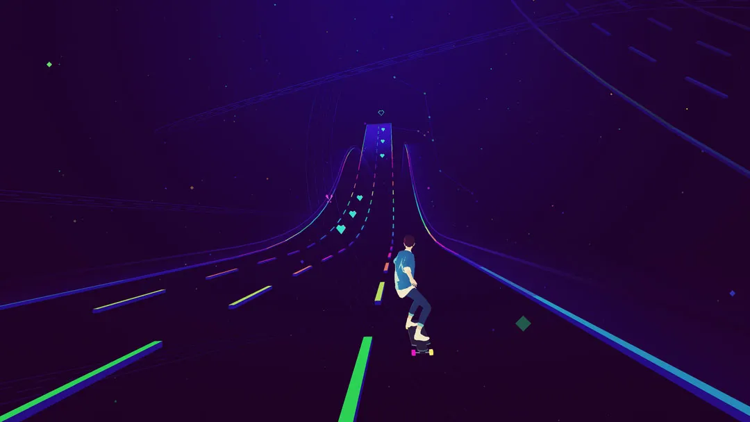 Sayonara Wild Hearts is mesmerizing to look at, but unfortunately it falters as a game. The first few stages get you acclimated to weaving your character left and right on the tracks, picking up heart shapes and other collectibles to earn higher scores. And really, that’s just about all there is. The perspective shifts in some impressive ways, with a camera that pulls back until your rider is a tiny speck or rotates woozily in tunnel sections where you ride freely on the walls and ceilings. Camera trickery aside, you’re doing the same basic thing throughout the short experience. A few moments break from that format, such as a VR-inspired game-within-a-game that plays a bit more like an arcade shooter, but these deviations are unfortunately all too brief.