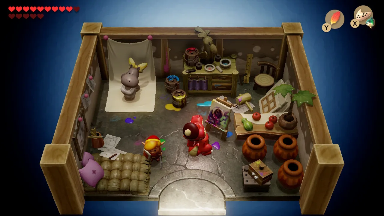 Rather than trying to recreate the sprites from the original version or making them adhere to the same presentation in A Link Between Worlds, Nintendo started from scratch in an unexpected way. It looks as though you’re engaging with a tiny plastic diorama; characters have a glossy sheen, and there’s an exaggerated depth-of-field effect that reinforces the illusion. It’s delightful, and it perfectly matches the story’s whimsical tone. This is, after all, a game where you help a goat and SimCity’s Mr. Wright cultivate a pen-pal relationship. The dialogue is as snappy as ever, with fourth-wall-breaking moments that still hold up today.