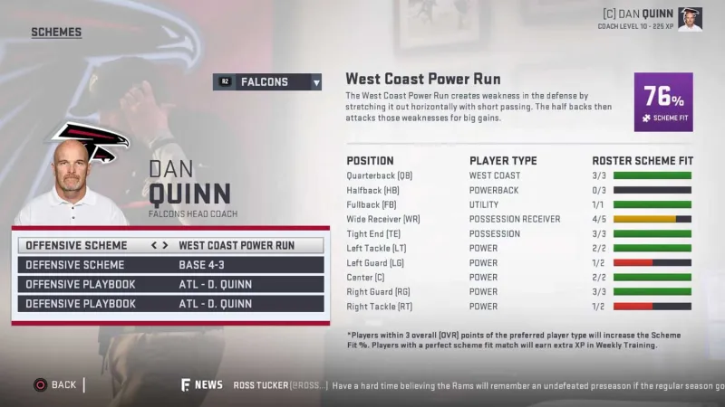 Madden 19’s new scheme fits system is a way to get players extra XP based on set archetypes. Because this is about XP, I like to use the system to bolster those position groups that need help. Therefore, don’t choose a scheme (one each for offense and defense) based on the percentage scheme fit shown on the screen, but on which positions you want to help. This can be changed from week to week, so if you’re looking to get extra XP for both your quarterback and your offensive line, for example, you may have to switch your scheme to benefit both.